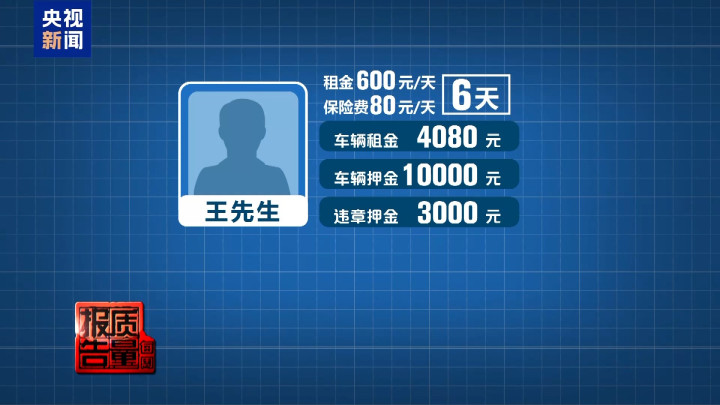 收到资料后,王先生看到租车企业证照齐全,便放下了戒心,对方声称可以异地还车,但需交纳1万元用车押金,考虑到假期紧张,租车公司手续看似齐全,王先生最终同意以每天600元租金,80元保险费的价格,租车6天,共4080元,并支付车辆押金1万元及违章押金3000元。