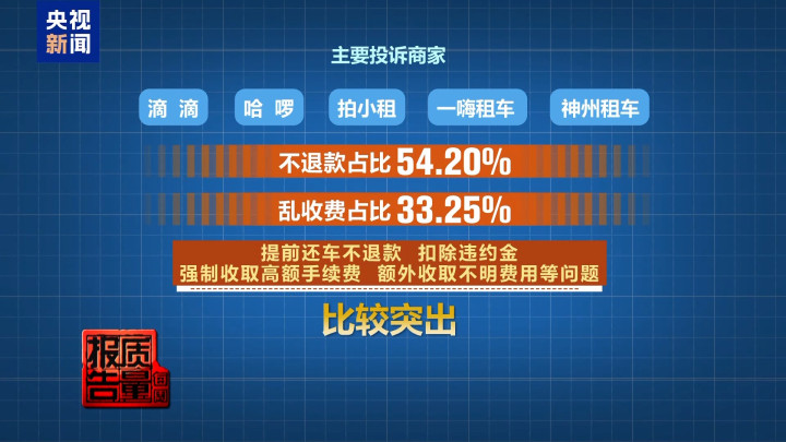 投诉问题中,不退款占比54.20%;乱收费占比33.25%。提前还车不退款、扣除违约金、强制收取高额手续费、额外收取不明费用等问题比较突出。