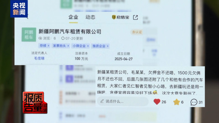 最终,罗某在警方督促下承诺三日内退还押金,但王先生告诉记者,截至目前,两万元押金仍未退回。记者进一步调查发现,涉事的“新疆阿鹏汽车租赁公司”,因不退押金被多次投诉。